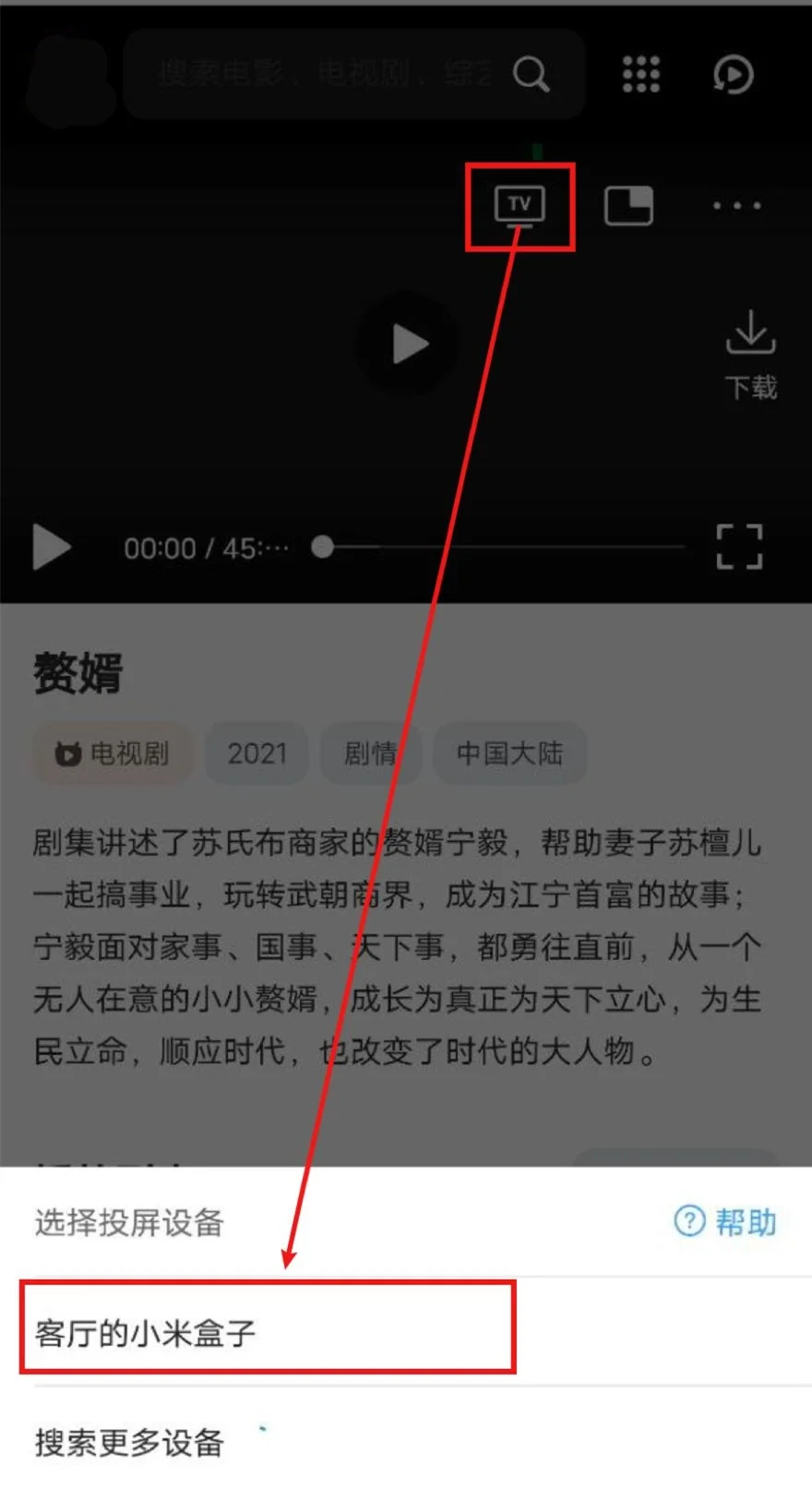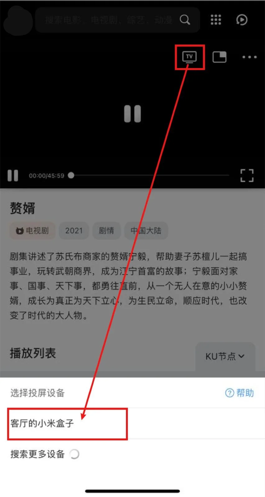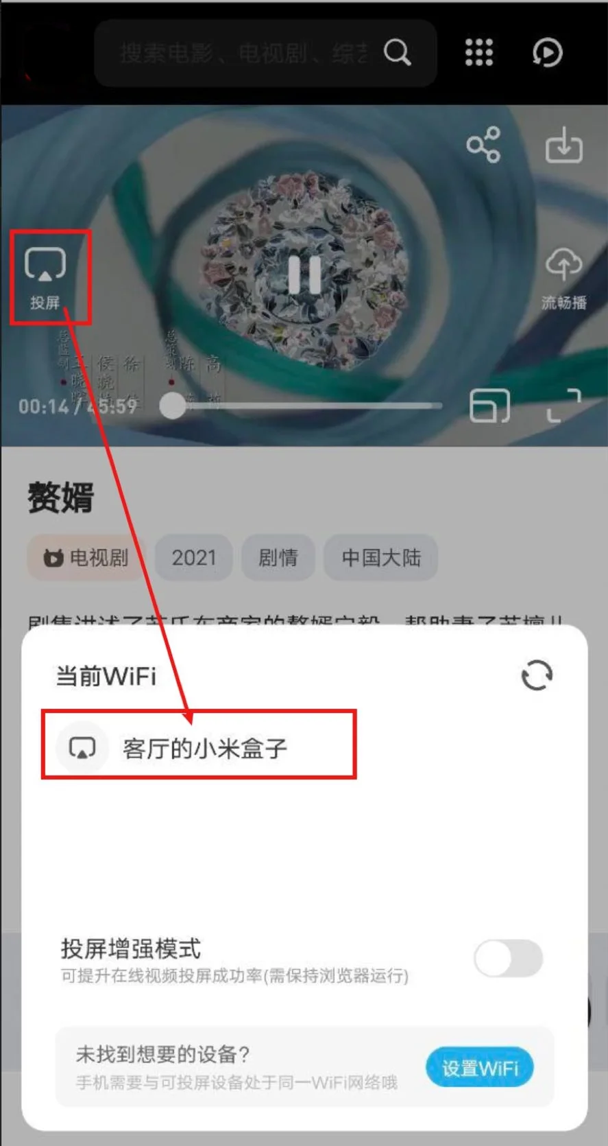 打开QQ浏览器(会接管网页播放器)->打开幻梦影视 - 因为热爱->播放视频->选中投屏图标->等待搜寻出智能电视/电视盒子->选中,即可投屏。