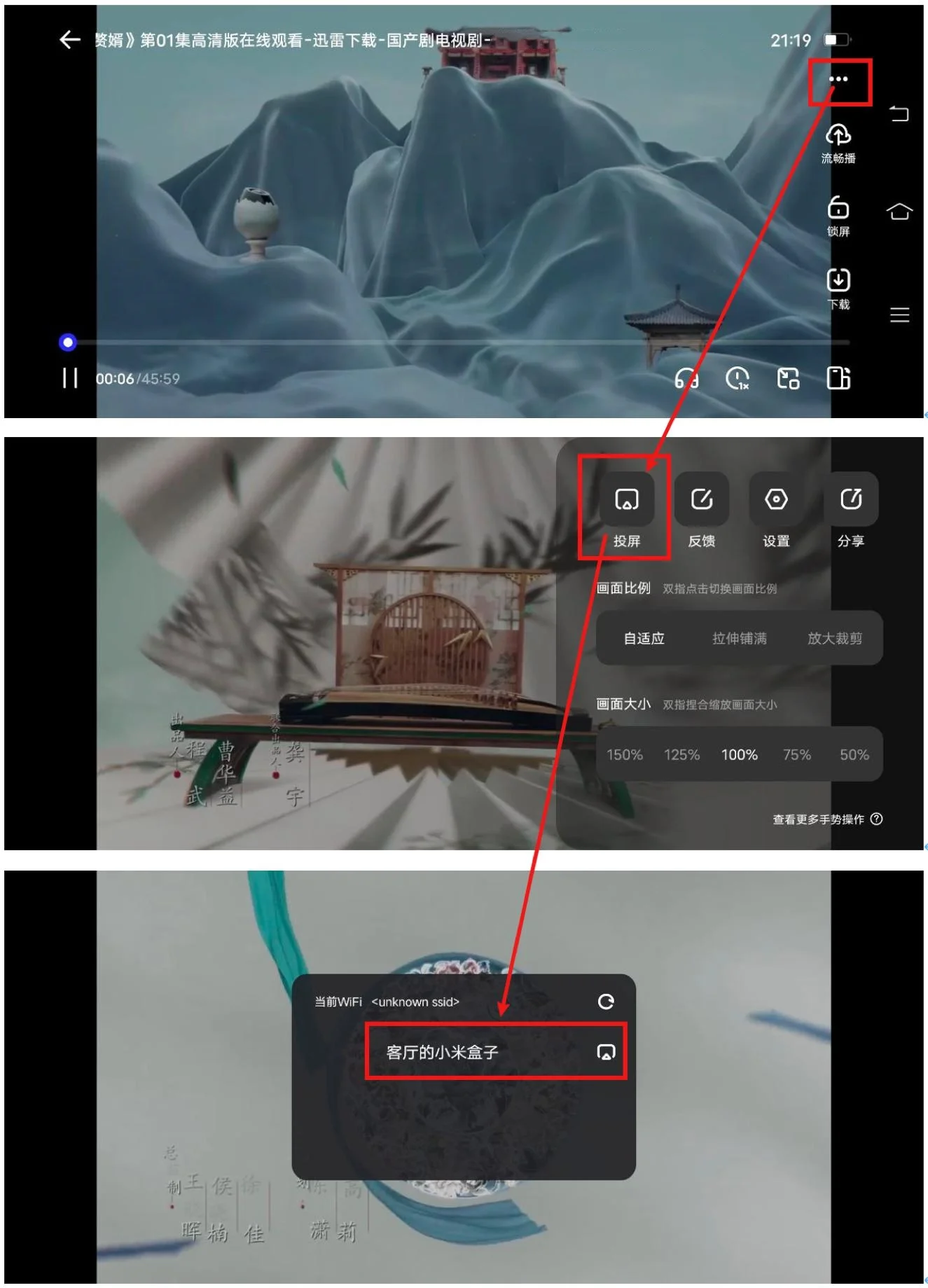 打开安卓UC浏览器->打开幻梦影视 - 因为热爱->开始播放->全屏->左下角投屏->等待搜寻到智能电视/电视盒子->选中,即可投屏。